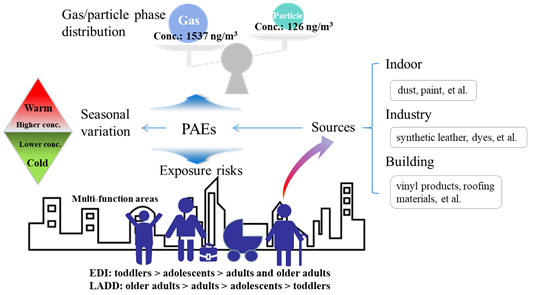 邻苯二甲酸酯(PAEs)是一类内分泌干扰物质。因具有软化塑料的性质,它被广泛使用在塑料制品中,PAEs已成为目前全世界使用最广泛、产量最大的一类增塑剂。研究发现,PAEs对生物胚胎发育和生殖健康均有显著危害,其污染现状和健康风险是当前环境生态领域的研究热点。文章系统研究了杭州市多功能区空气中PAEs的污染特征,分析了PAEs的污染水平和影响因素,采用PCA模型解析了PAEs的污染来源和贡献,探讨了气/固相分配机制并且评估了幼儿、青少年、成年人和老年人等四类人群的暴露风险。该工作为探明PAEs的环境行为、保护人群健康提供了理论依据和数据支持。