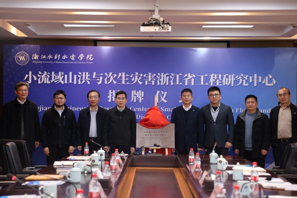 与会领导、专家学者共同为“小流域山洪与次生灾害浙江省工程研究中心”揭牌。