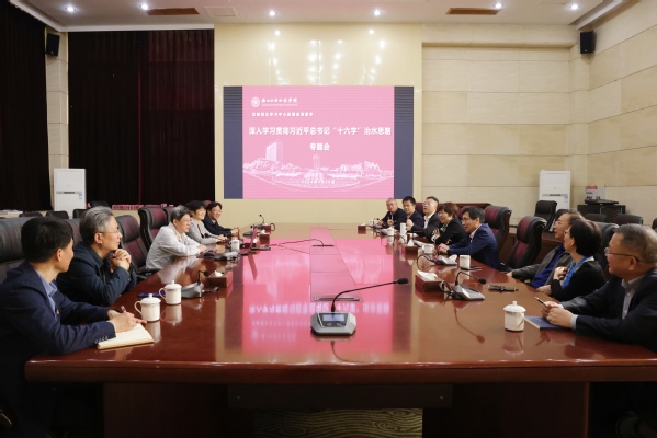 校党委书记钱天国指出,习近平总书记“十六字”治水思路内涵博大精深,对学校研究治水、服务治水、培养治水人才具有十分重要的指导意义,要进一步加强学习和转化,自觉将蕴含其中的立场、观点和方法运用于办学治校实践。要进一步发挥水利水电办学特色,建好用好水文化研究院,加强水文化教育、研究、传播;充分发挥全国首家河(湖)长学院作用,强化行业产业对接,积极开展治水研究、培训和服务。要把学习贯彻习近平总书记“十六字”治水思路、习近平生态文明思想、习近平文化思想等与深入贯彻“贺信精神”结合起来,开好学校第二次党代会,坚定不移走高质量有特色发展道路,锚定“申硕”和高水平应用型大学建设目标,奋力谱写高质量有特色发展新篇章。